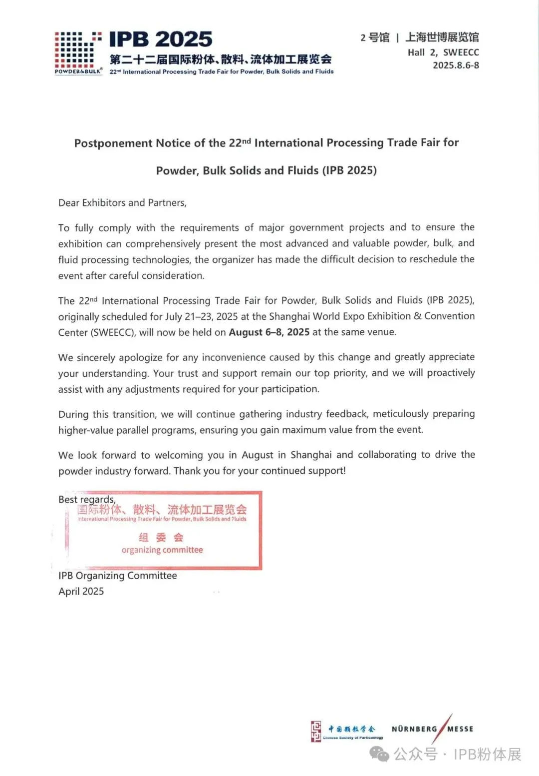 为全力配合政府大型重点项目的推进需要,主办方经慎重权衡,不得不做出相应调整。现决定将原定于2025年7月21日至23日在上海世博展览馆举办的第二十二届国际粉体、散料、流体加工展览会(IPB 2025)延期至2025年8月6日至8日,地点不变。